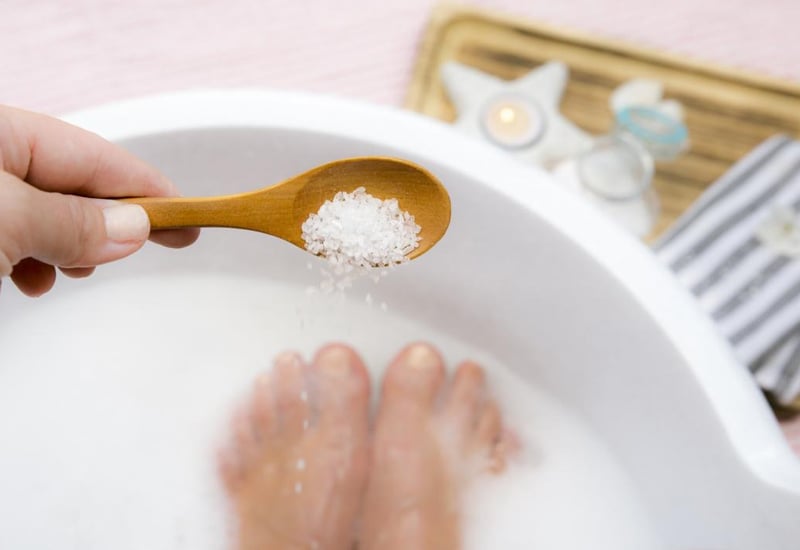 Những người đi giày bị đau ngón chân sẽ dễ chịu hơn sau khi ngâm với nước muối Epsom (muối hạt to). Bởi trong muối này chứa một lượng magie, chúng làm dịu cơn đau hiệu quả.