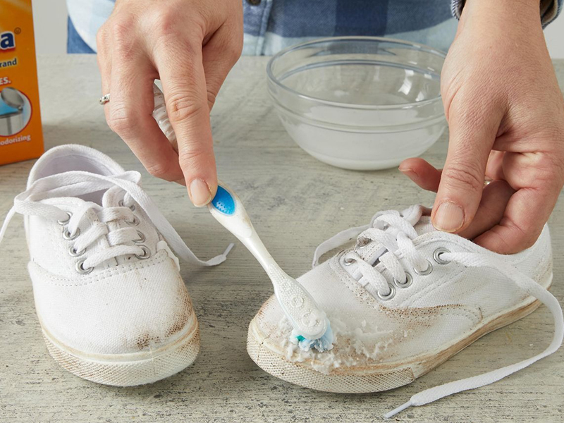 Sau đó bạn tiến hành ngâm giày trong hỗn hợp giấm và baking soda khoảng 30 - 60 phút trước khi cho giày vào máy. Cách giặt giày này rất hiệu quả, được nhiều người kiểm chứng. Hỗn hợp baking soda và giấm lành tính có tác dụng không kém chất tẩy rửa hóa học.