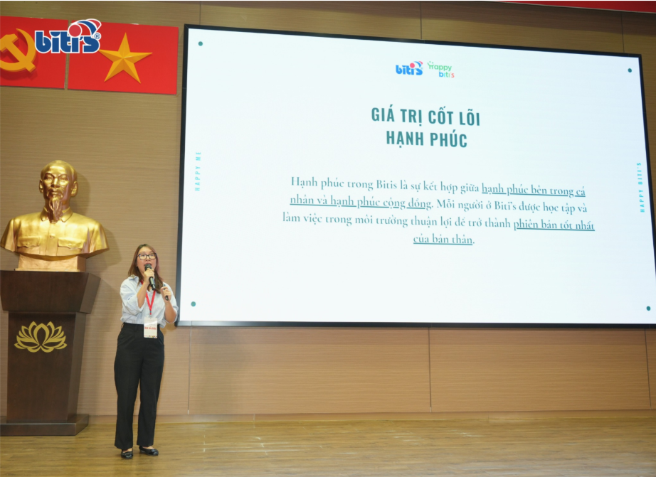 Đại diện Biti’s, bà Nguyễn Minh Giang - Giám đốc Phát triển Bền vững, đã được mời tham gia với vai trò chuyên gia đồng hành, chia sẻ về dự án “Happy Me - Happy Biti’s” chăm sóc cộng đồng bên trong doanh nghiệp, nuôi dưỡng tinh thần hạnh phúc và gắn kết cho hơn 6000 CB-CNV trên toàn quốc.