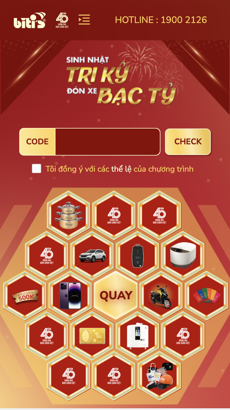 | - In kèm hóa đơn sau khi đã thanh toán. - Với mỗi mức 400,000đ sẽ nhận được 01 lượt quay thưởng. - 01 mã dự thưởng in kèm trên hóa đơn có thể chứa nhiều lượt quay thưởng. - Mỗi hoá đơn có thể có nhiều lượt quay thưởng tương ứng với giá trị hóa đơn và nó là bội số của 400.000đ. - Mã dự thưởng in ngay trên hóa đơn sau khi thanh toán. | - Mã được in trên thẻ cào sau khi thanh toán đơn hàng cho đại lý. - Với mỗi mức 400,000đ sẽ nhận được 01 thẻ cào. - Mỗi thẻ cào chỉ có 01 mã dự thưởng tương ứng với 01 lượt quay duy nhất. - Mỗi hóa đơn có thể có nhiều thẻ cào tương ứng với giá trị hóa đơn và nó là bội số của 400.000đ. - Thẻ cào sẽ được nhân viên tại Đại lý Biti’s phát trực tiếp cho khách hàng ngay khi thanh toán xong. | - Mã dự thưởng sẽ được gửi qua tin nhắn SMS Brandname BITIS hoặc email xác nhận đơn hàng. - Với mỗi mức 400,000đ sẽ nhận được 01 lượt quay thưởng. - 01 mã dự thưởng được gửi qua tin nhắn SMS Brandname BITIS hoặc email xác nhận đơn hàng có thể chứa nhiều lượt quay. - Mỗi đơn hàng có thể có nhiều lượt quay thưởng tương ứng với giá trị đơn hàng và nó là bội số của 400.000đ. - Mã dự thưởng sẽ được gửi ngay tại thời điểm khách hàng thanh toán thành công đơn hàng trên website. |