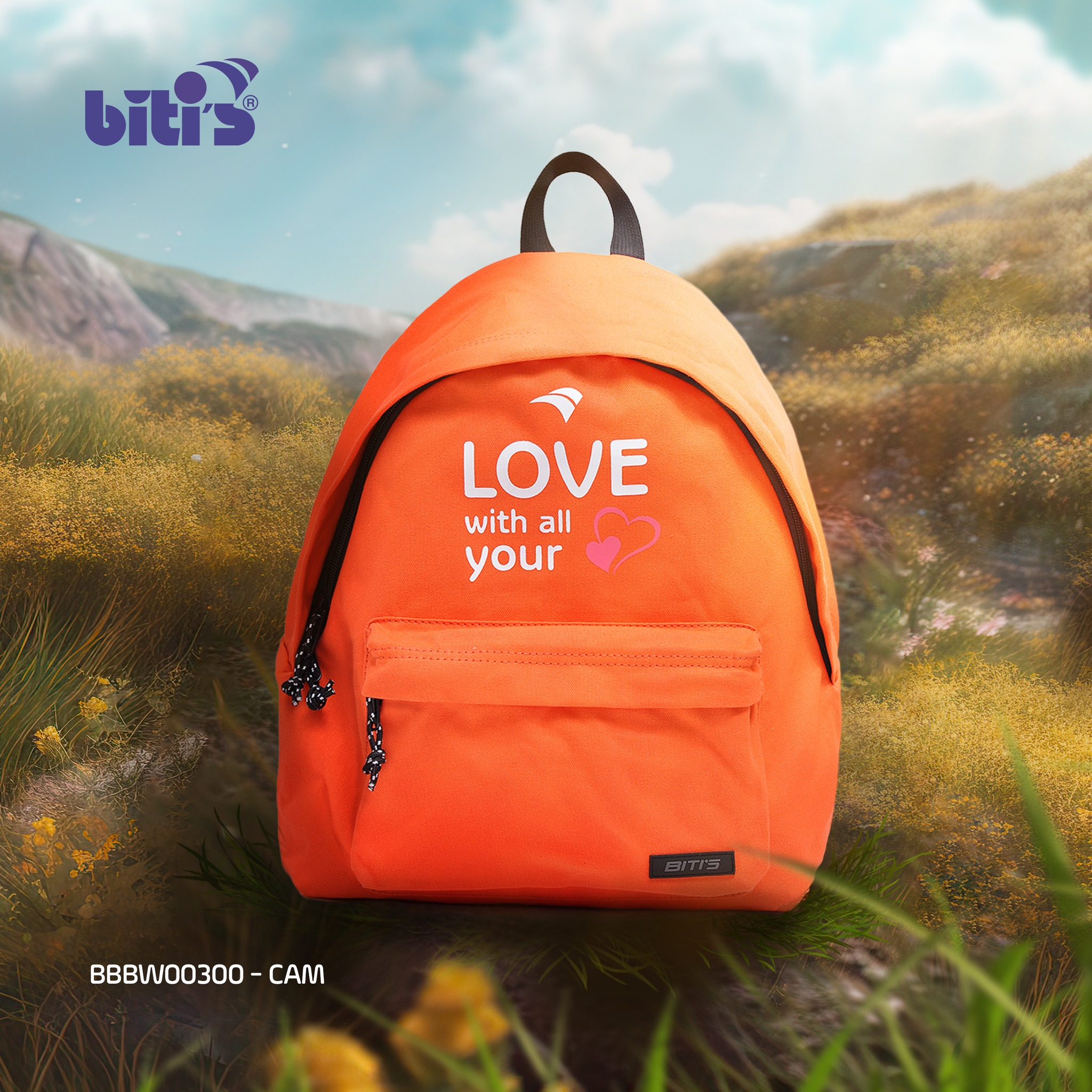 Biti’s có 4 lựa chọn cho bạn về màu sắc: Cam rực rỡ, vàng tươi tắn, rêu tự nhiên, đen tối giản với điểm nhấn là dòng chữ “love with all your” để thay lời muốn nói lan tỏa yêu thương tới mọi người. Sản phẩm mang đậm phong cách thời trang Gen Z và là phụ kiện không thể thiếu cho bác em khi đi học hay đi chơi.