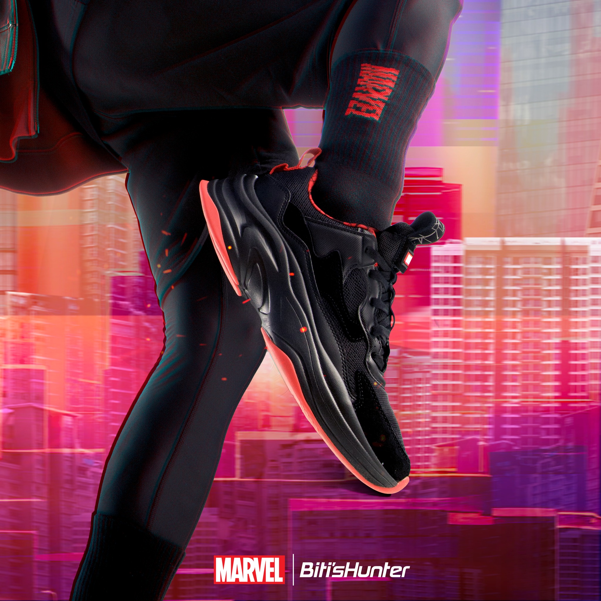 Đây là phiên bản được thiết kế lấy cảm hứng từ vũ trụ Marvel mang tên Biti’s Hunter x Marvel, phiên bản hợp tác đặc biệt đi cùng bộ phim Spider-Man: Across the Spider-Verse. Phối màu all black lấy cảm hứng từ bộ suit của Spider-man Miles, tính ứng dụng đa năng với tone màu dễ dàng đi cùng mọi trang phục mix-match.